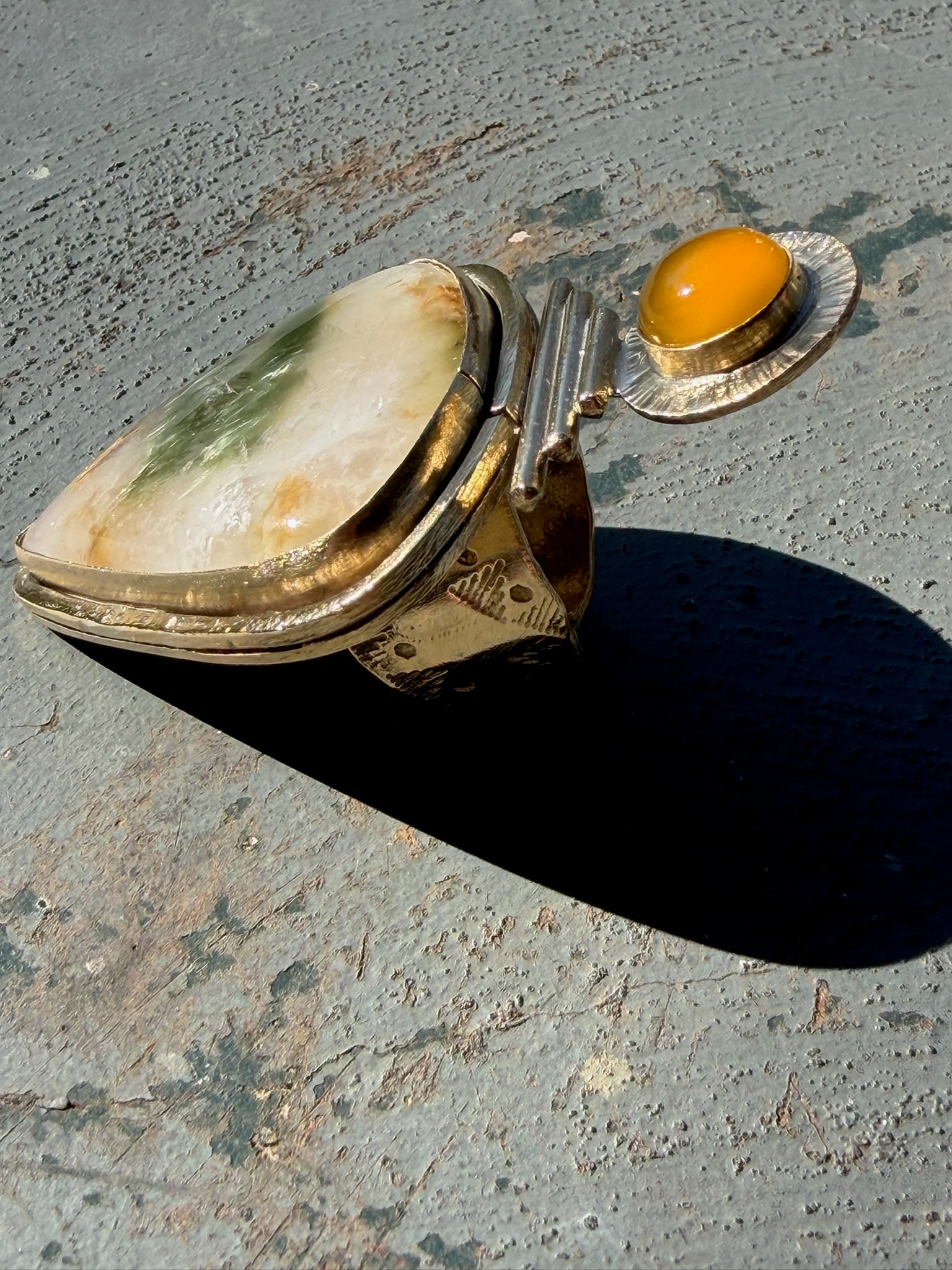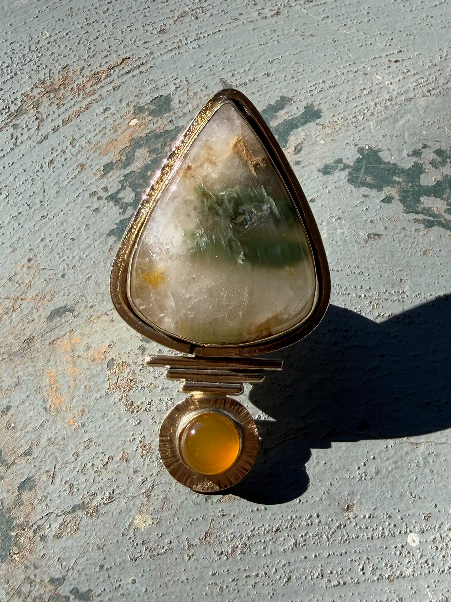 Garden quartz, yellow chalcedony and hand hammered brass. Size 7.5