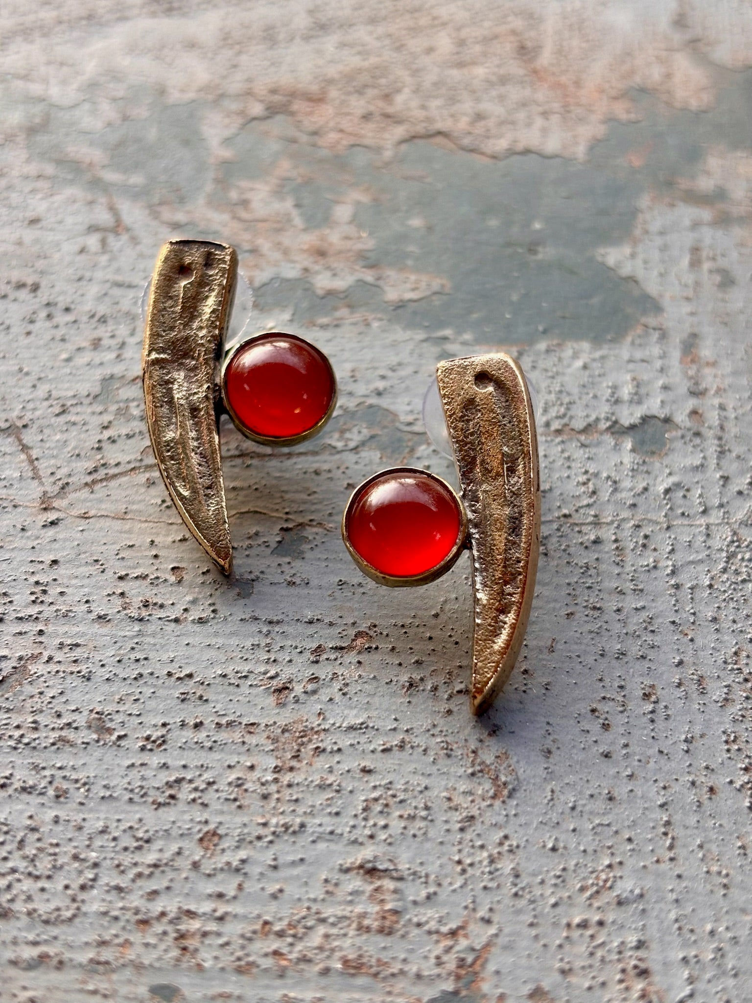 Sand cast recycled brass and carnelian earrings