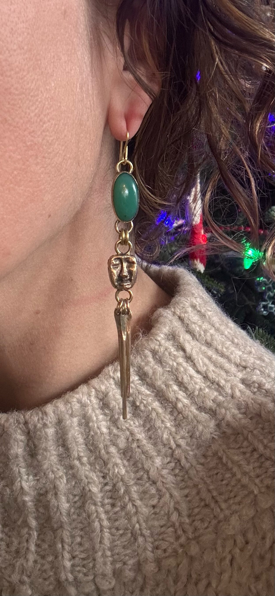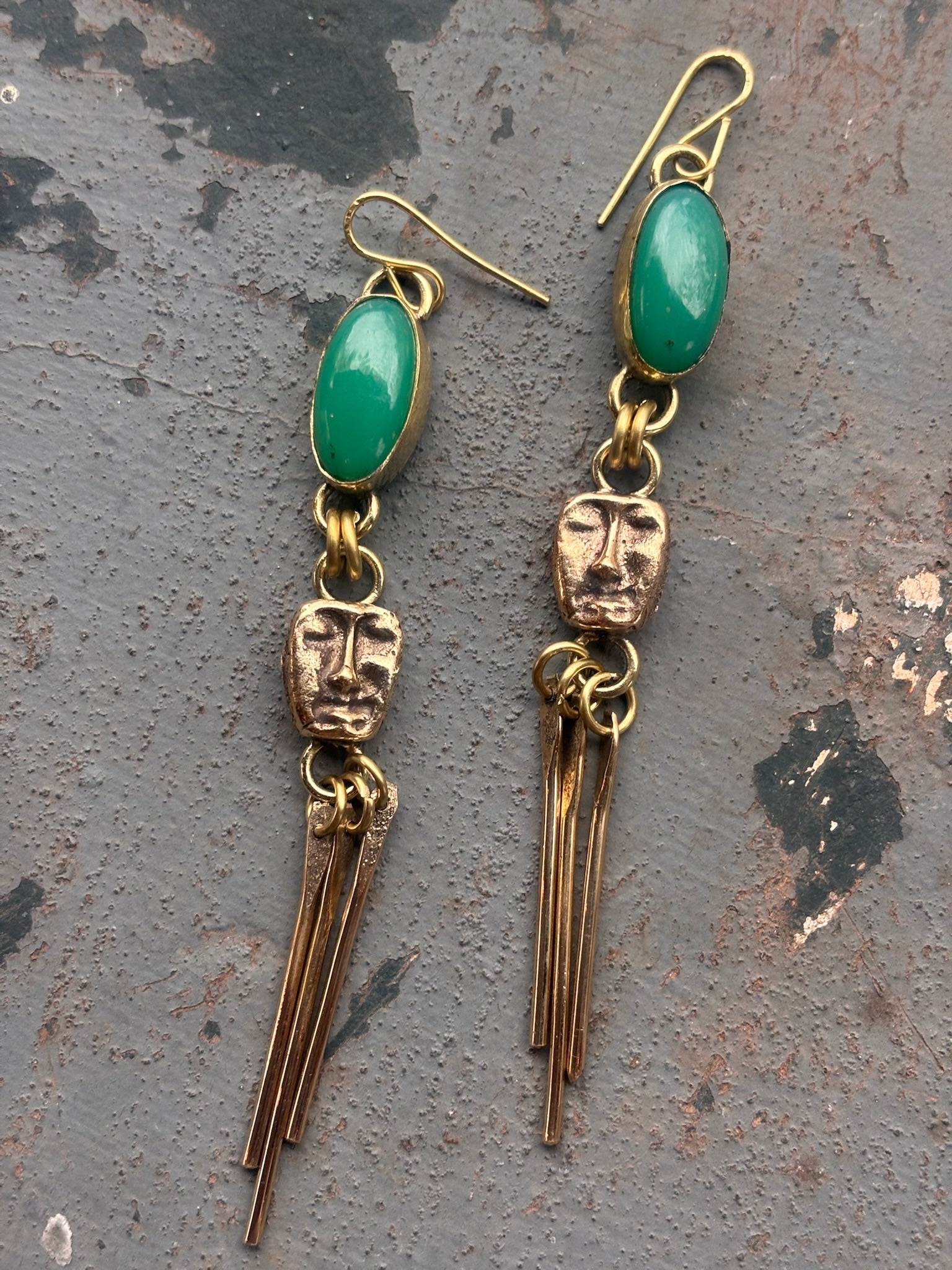 Sand cast recycled brass faces and chrysoprase earrings