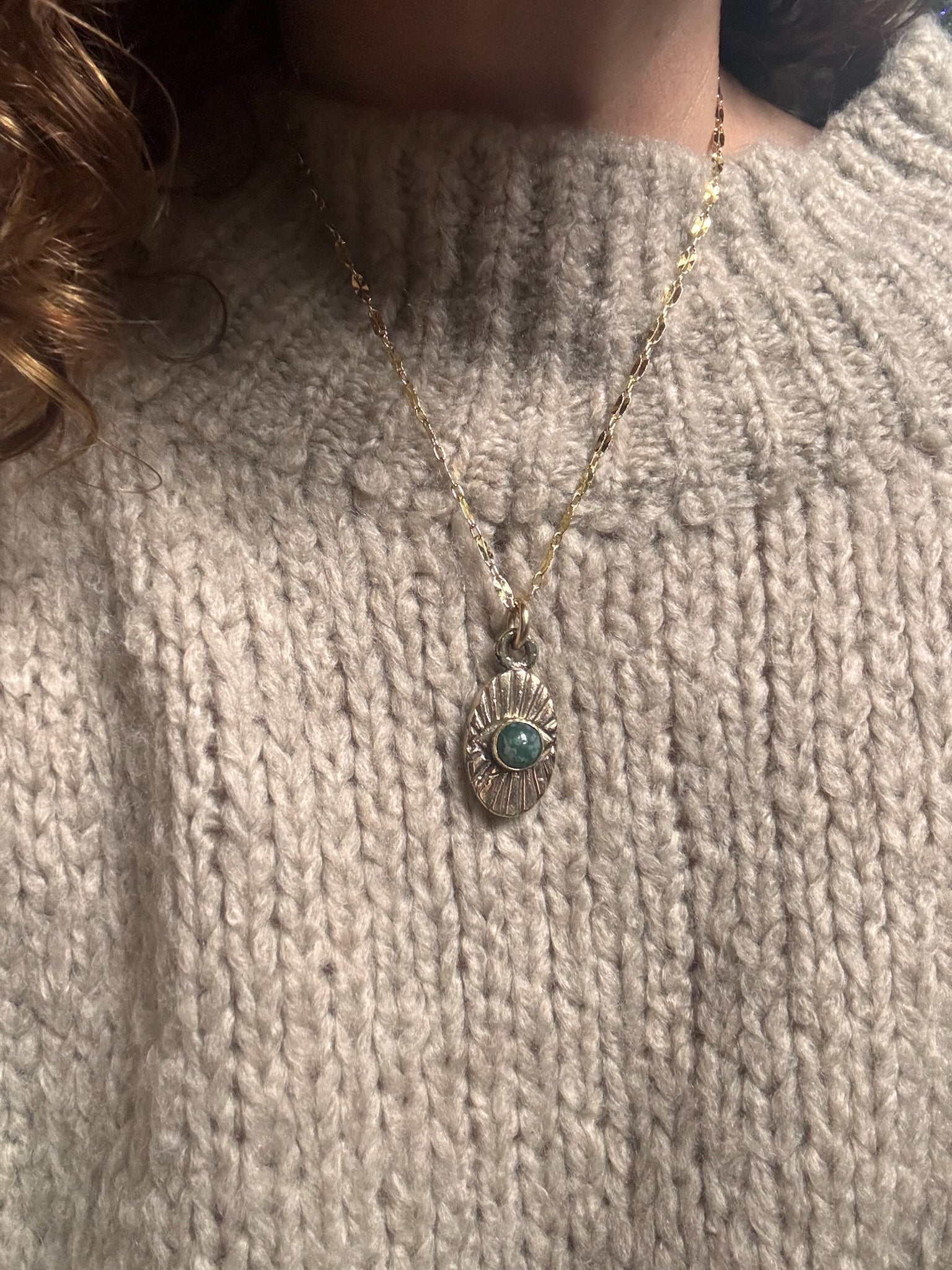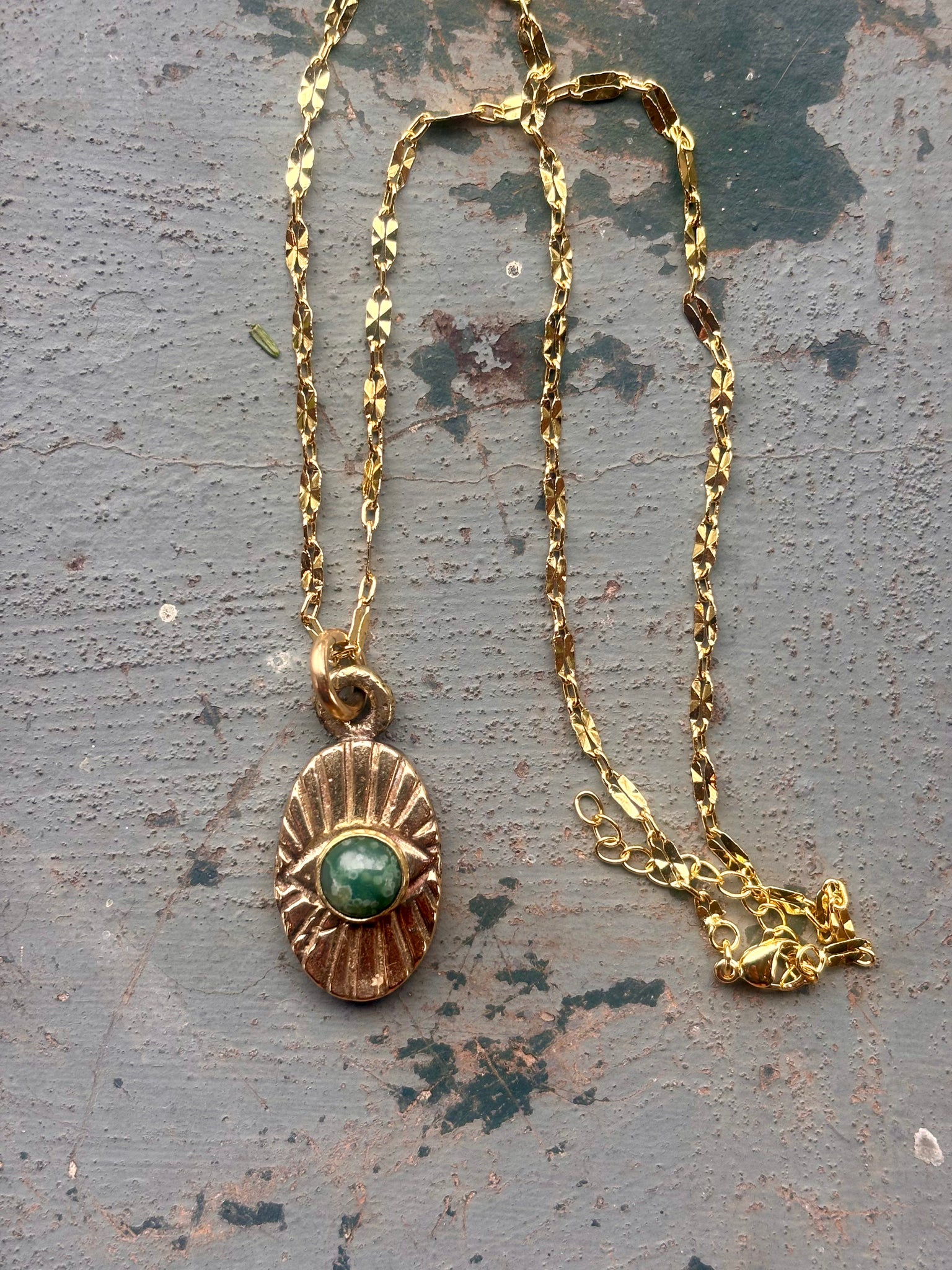 Recycled sand cast brass and green moss agate all seeing eye necklace.