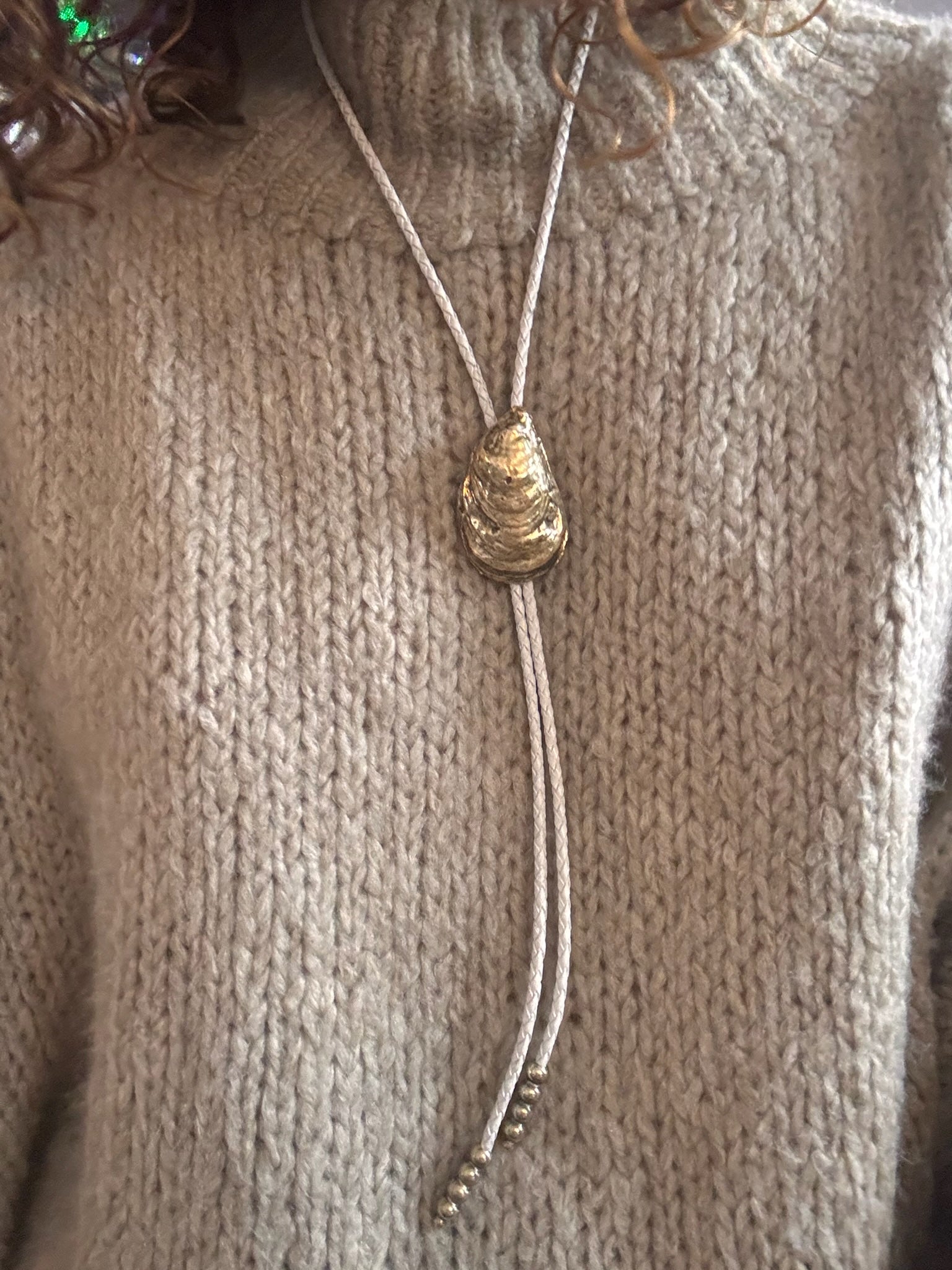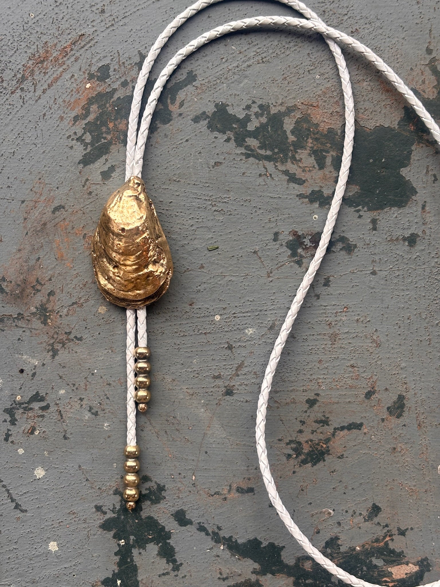 Brass Sand Cast Oyster Bolo Tie. Cord measures 36"