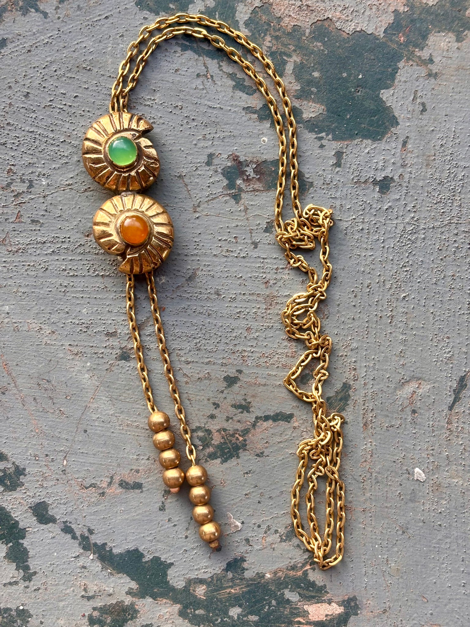 Recycled sand cast brass shell bolo with green onyx and Baltic amber.
