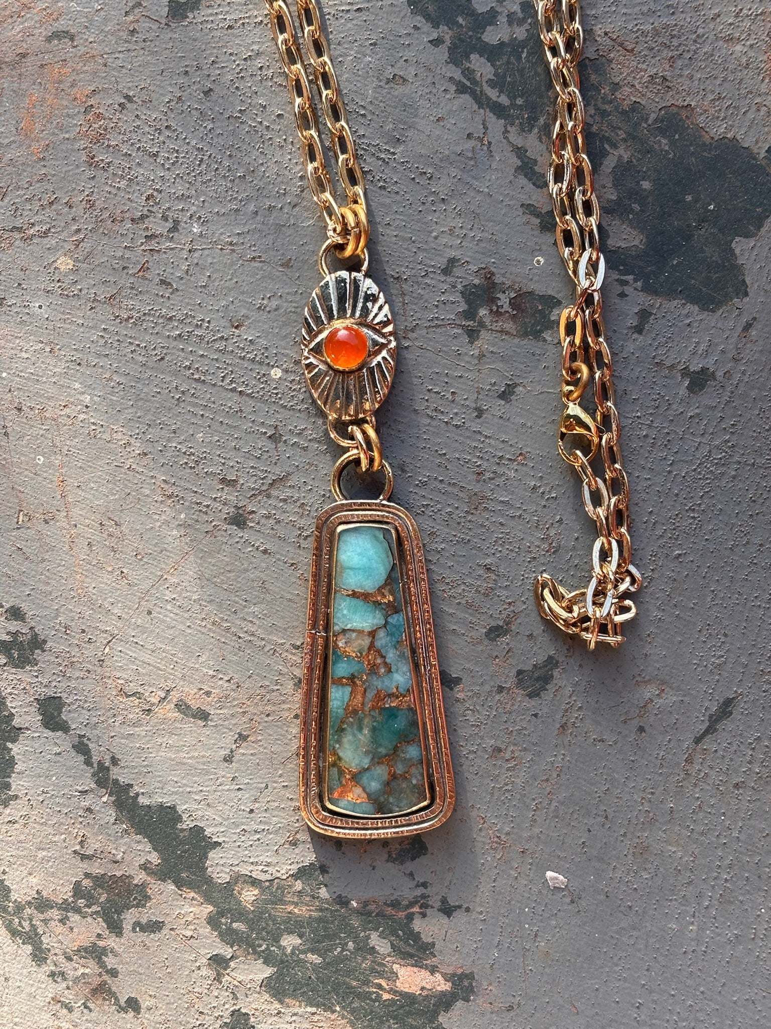 Carnelian and brass sand cast all seeing eye and Peruvian Amazonite.